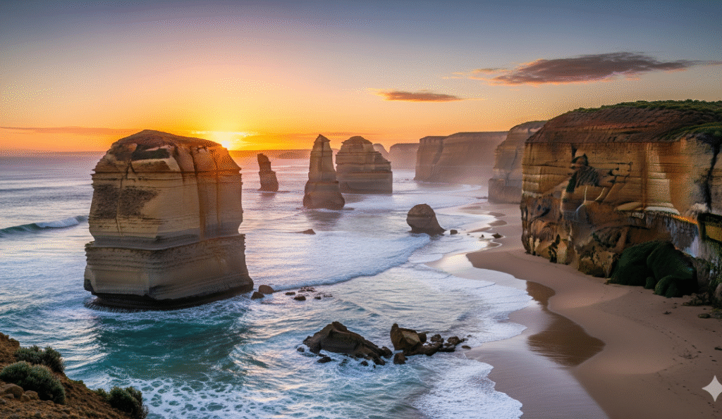 The Great Ocean Road is one of the most beautiful coastal drives in the world. It starts in Melbourne and takes you past the famous Twelve Apostles limestone stacks, surf towns, and golden beaches.